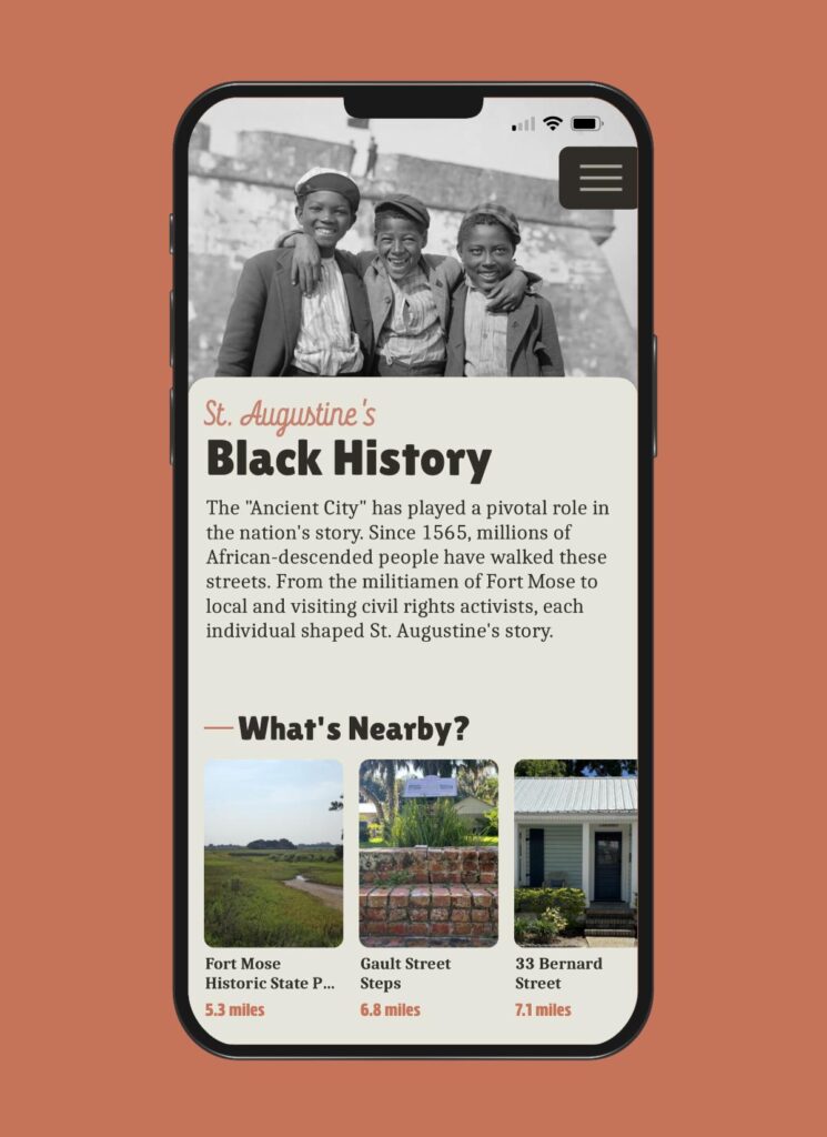 • Lincolnville, un barrio histórico fundado en 1866 por antiguos residentes esclavizados, se convirtió en un centro de la actividad por los derechos civiles en la década de 1960. El Dr. Martin Luther King Jr., el Dr. Robert B. Hayling, el reverendo Andrew Young y C.T. Vivian estuvieron entre los líderes que se organizaron y residieron allí.